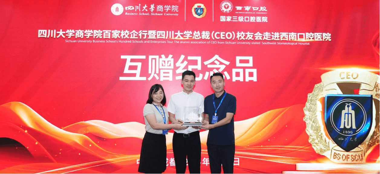 四川大学商学院,四川大学总裁(CEO)校友会和西南口腔医院进行了纪念品互赠,通过互赠纪念品的方式搭建友谊之桥。